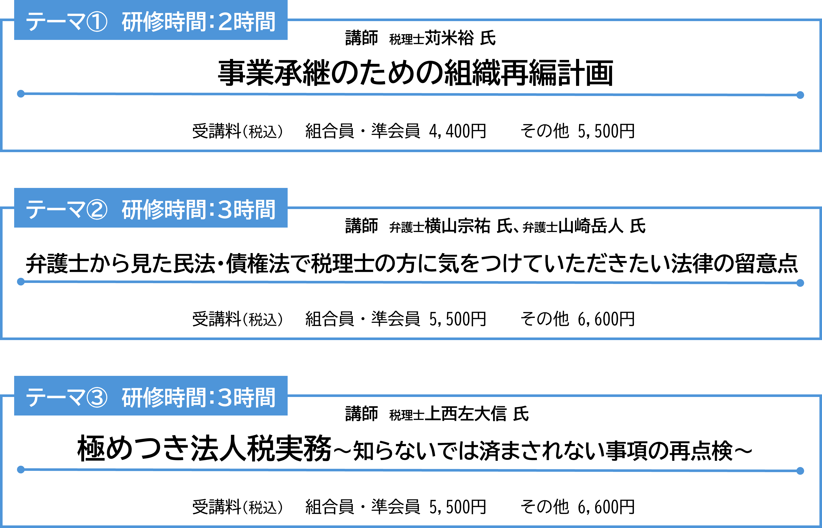 申込方法 | 各研修会の「詳細はこちら」から詳細をご確認いただき、該当する「組合員・賛助会員の方はこちら」「非組合員の方はこちら」ボタンより進んでいただき、「視聴お申込み登録」ページにて必要事項を入力してください。 |